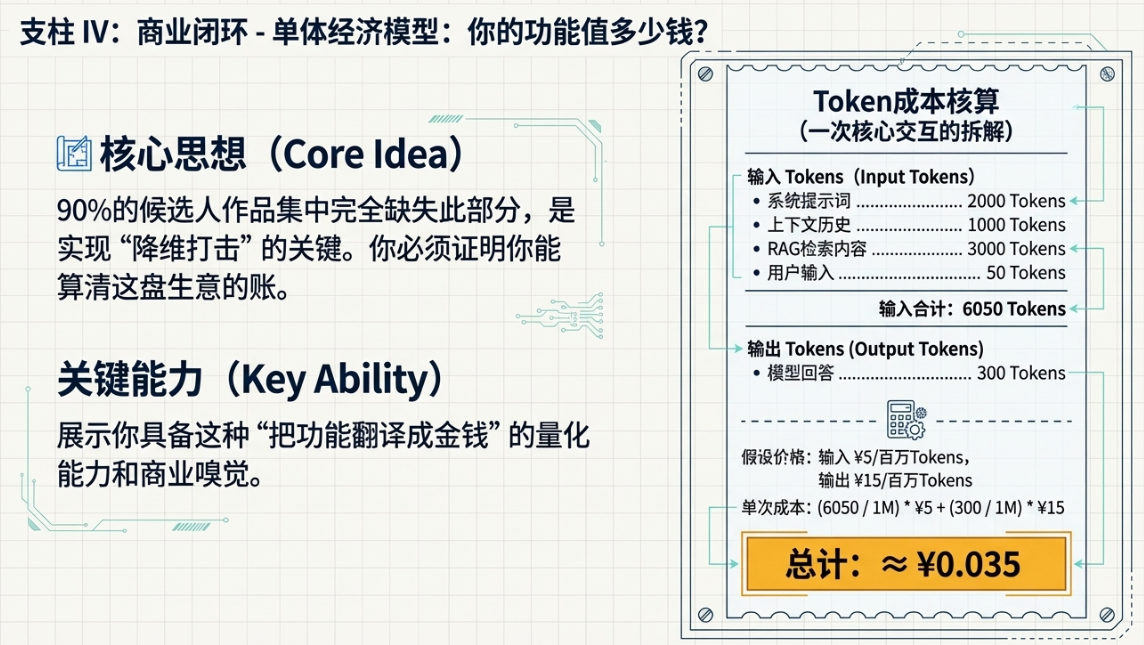 聊到这儿,我们已经把一个AI产品的选题、架构、体验都聊得差不多了。如果你的作品集能把前面三章的内容都讲透,说实话,已经能超过80%的候选人了。但如果你想成为那顶尖的10%,想真正打动那些手握预算、决定你薪资的业务负责人,你还必须展示你的最后一项,也是最硬核的能力:算账。