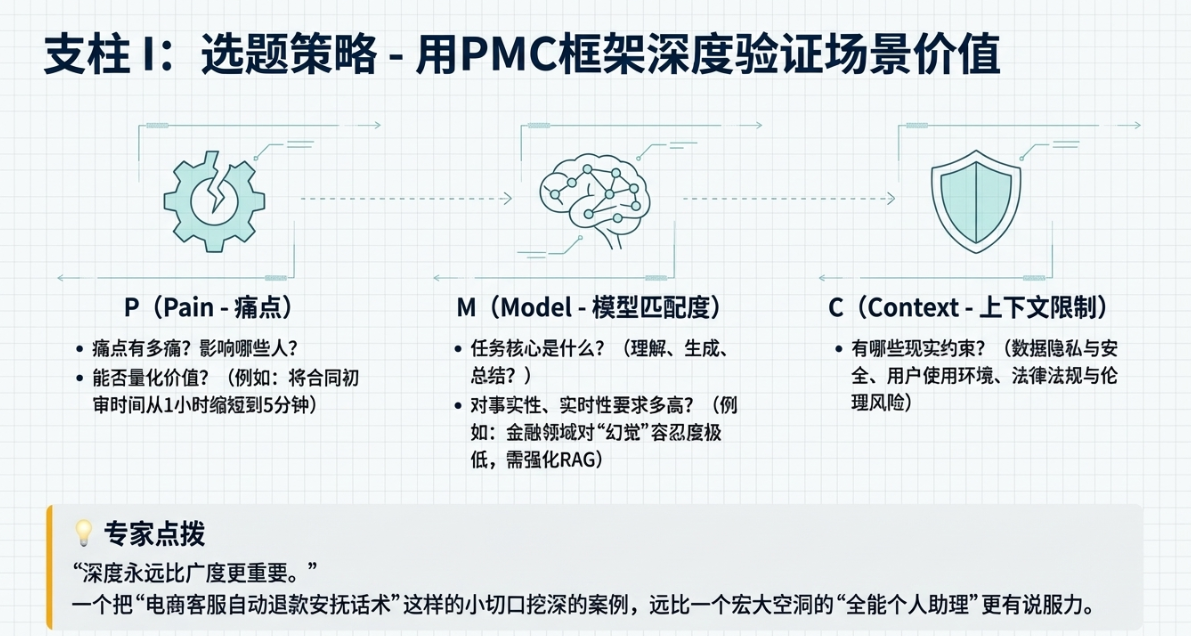 好,现在你找到了一个看似靠谱的L2场景,怎么进一步验证它的价值,并且在作品集里把它讲清楚呢?我习惯用一个简单的框架,叫PMC分析框架。P就是Pain(痛点),M是Model(模型匹配度),C是Context(上下文限制)。