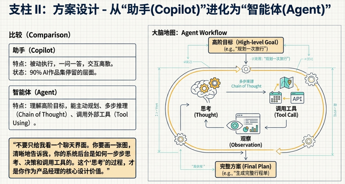 绝大多数作品集里的产品,都停留在Copilot这个层面。这没有错,很多场景下Copilot已经足够好用。但如果你想展示更深的产品架构能力,你就必须往Agent的方向去思考。
