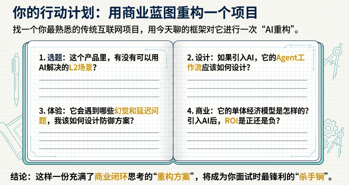 所以,如果你想让你的作品集真正发光,就请忘掉那些表面的“玩具感”。我给你一个非常具体的行动建议:找一个你过去做过的、你最熟悉的传统互联网项目,无论是一个电商功能,一个社区产品,还是一个效率工具。然后,用我们今天聊的这套框架,去对它进行一次“AI重构”。