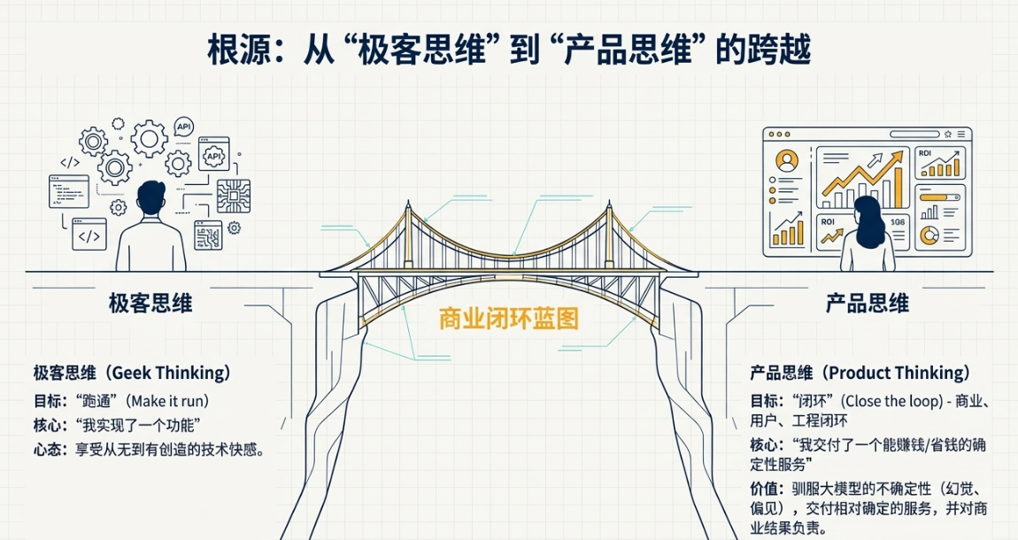 可企业招产品经理,尤其是在AI这个烧钱不见底的领域,要的根本不是这种思维。企业要的是“产品思维”。产品思维的核心是什么?是闭环。商业闭环、用户体验闭环、工程闭环。企业需要的是一个操盘手,一个能驾驭不确定性的人。大模型这东西,本身就是个不确定性的黑盒,充满了“幻觉”、偏见和不稳定性。一个成熟的AI产品经理,他的价值恰恰体现在,如何用各种产品设计、工程策略和商业考量,把这个“不确定”的黑盒,驯化成一个“相对确定”的服务,交付给用户,并且还能帮公司赚到钱,或者省下钱。
