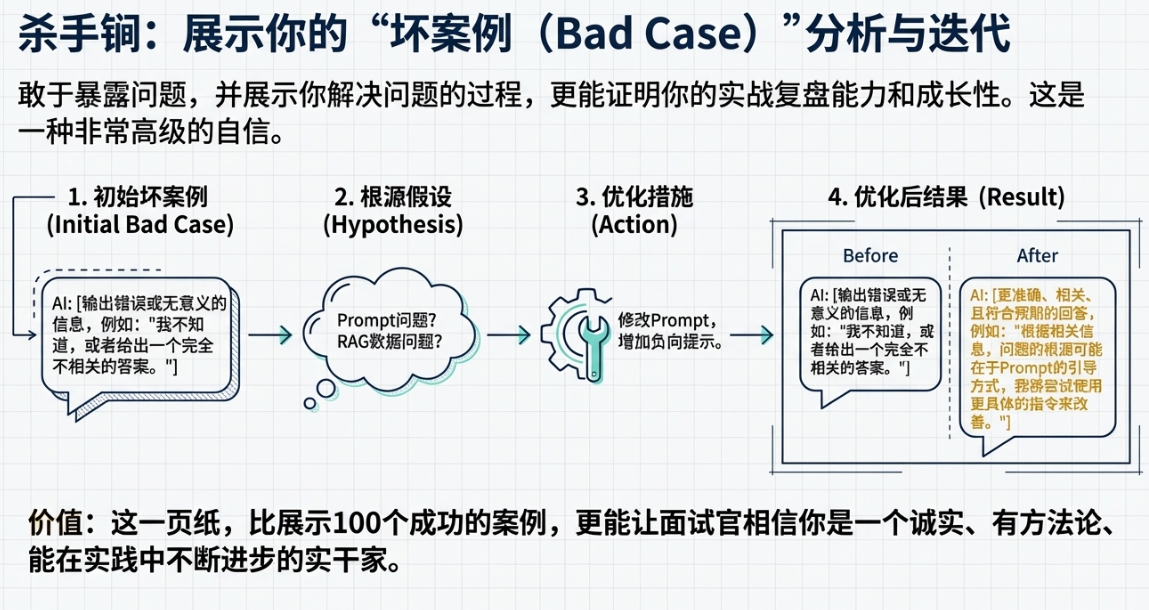 说个能让你作品集脱颖而出的“大杀器”:专门增加一页,叫做“Bad Case(坏案例)分析与优化记录”。