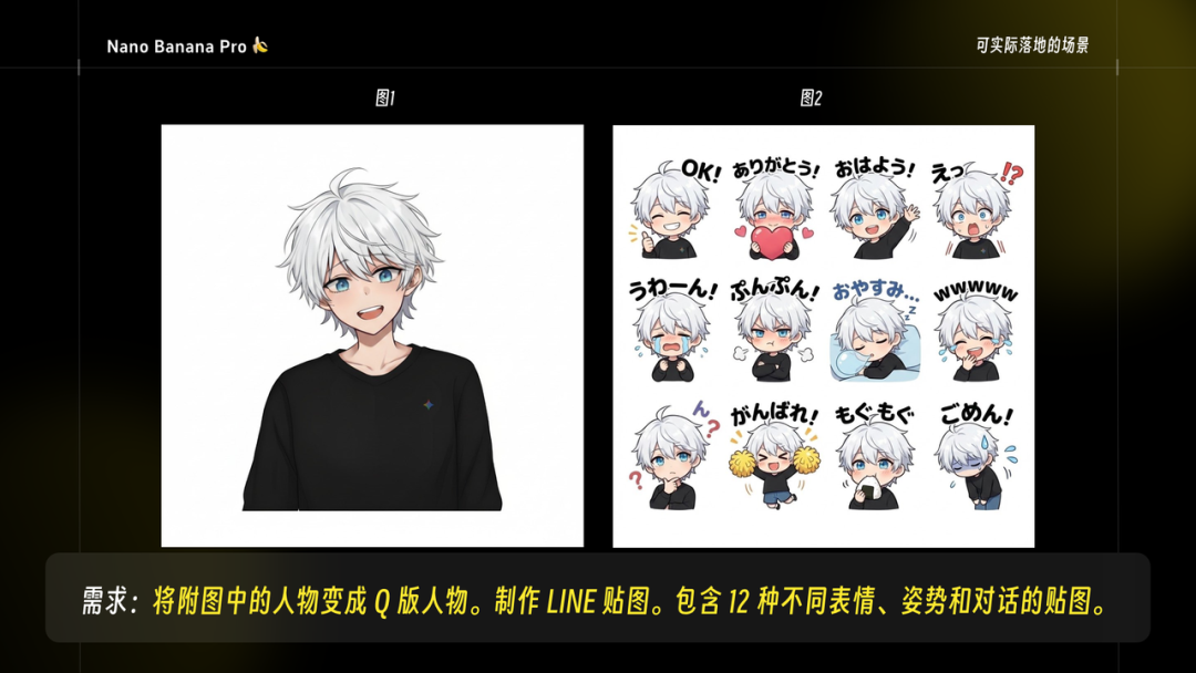 如果你也想制作贴图,可以试试这个提示:将附图中的人物变成 Q 版人物。制作 LINE 贴图。包含 12 种不同表情、姿势和对话的贴图。