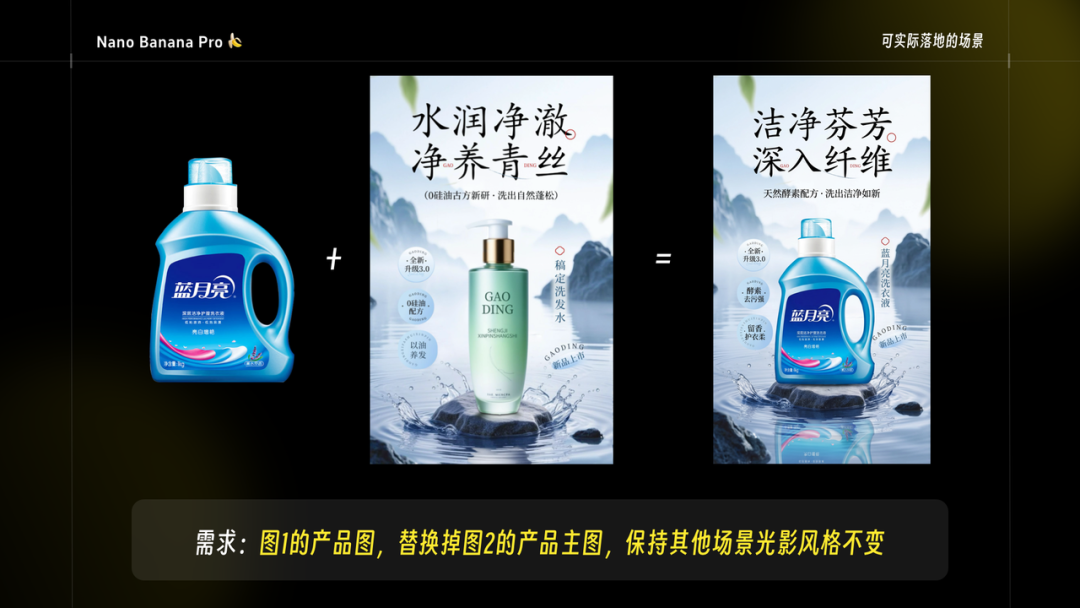 如果有一个具体的产品,同时还想复刻想要的海报风格,直接上传两张图就行,就能得到一张背景、细节元素、文字都和你的产品一一对应的海报,同时产品还能保持高度的一致。看一下生成的光影细节 太炸裂了。