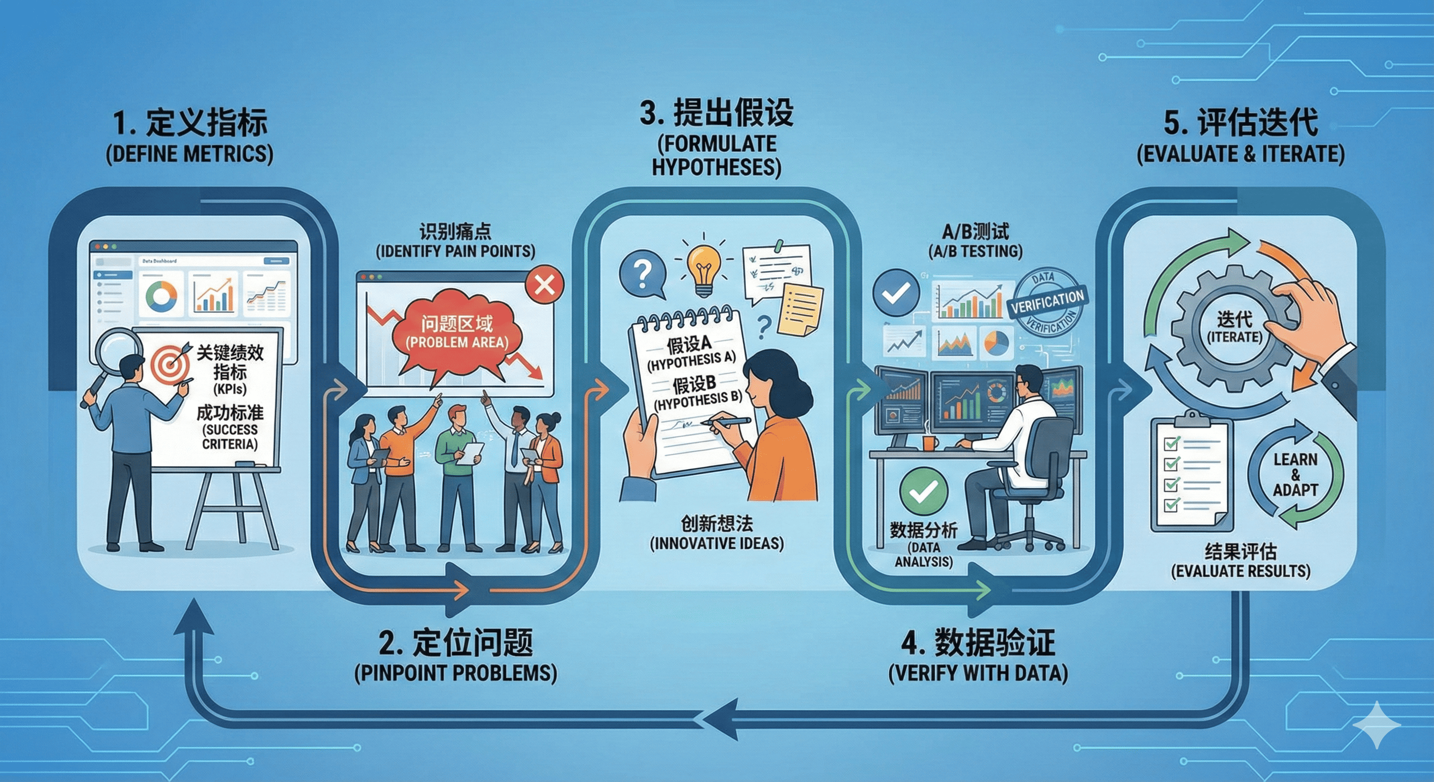 定义指标-定位问题-提出假设-数据验证-评估迭代