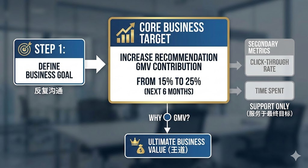 第一步也是最重要的一步,就是明确我们的业务目标。真实工作场景中需要经过和各方反复沟通,例如最终可以将这个推荐系统的核心业务目标确定为:在未来6个月内,将推荐模块带来的GMV占比从目前的15%提升到25%。