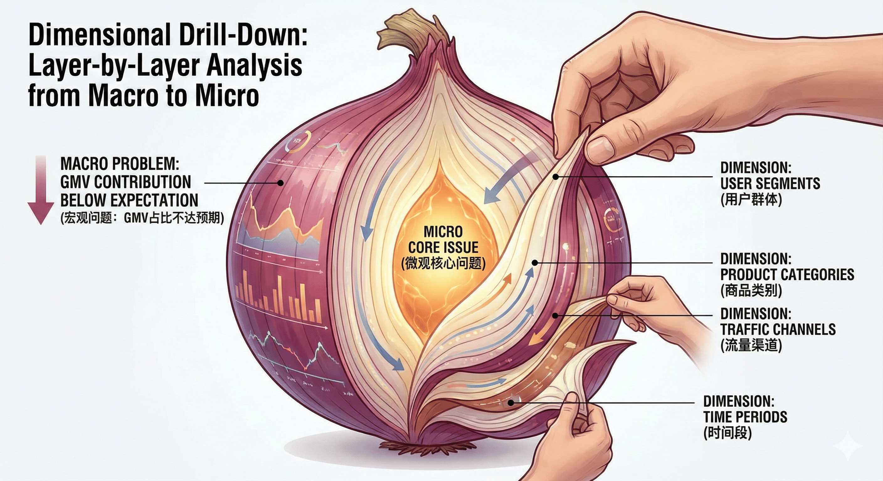 发现了GMV占比不达预期这个宏观问题后,我们需要做的就是”下钻”——从不同维度对数据进行细分分析,找出问题到底出在哪里。这个过程就像是剥洋葱,一层一层地剥,直到找到最核心的问题所在。