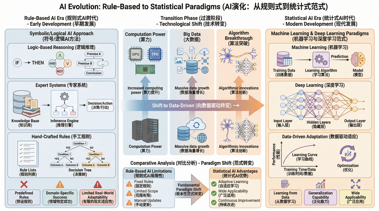 人工智能(AI)的发展并非一蹴而就,它经历了一条从理论萌芽到技术爆发的曲折路径。早期以逻辑推理和专家系统为代表的“规则式AI”,试图通过预设的规则库模拟人类专家的决策过程,在特定领域取得了初步成功。然而,它的局限性也显而易见——没有办法处理规则之外的复杂现实世界问题。随着算力的提升和数据的海量增长,以机器学习,特别是深度学习为核心的“统计式AI”时代到来,AI的发展范式发生了根本性转变。