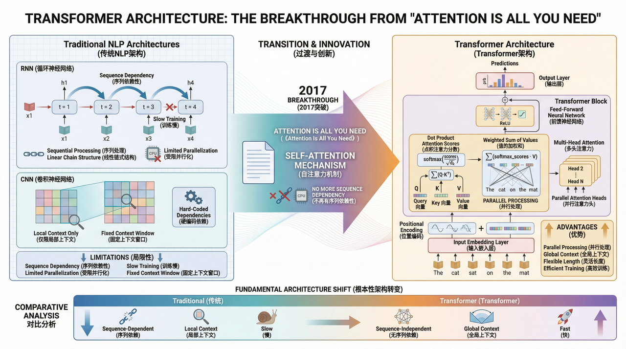 2017年,Google一篇名为《Attention Is All You Need》的论文,正式提出了Transformer架构。这一架构摒弃了传统在自然语言处理中占据主导地位的循环神经网络(RNN)和卷积神经网络(CNN)的序列依赖结构,完全依赖于“自注意力机制”(Self-Attention)来捕捉输入数据中的依赖关系。自注意力机制的核心思想在于,模型在处理一个词时,能够同时关注到输入序列中的所有其他词,并计算出每个词对于当前词的重要性权重。