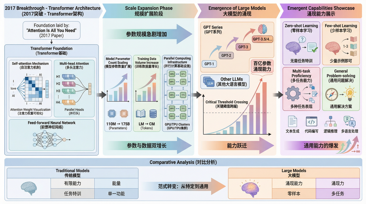 在Transformer架构奠定的基础上,通过急剧增加模型参数规模和训练数据量,人工智能领域迎来了“大模型”(Large Models)时代。以OpenAI的GPT(Generative Pre-trained Transformer)系列为代表的大语言模型(LLM),展示了惊人的“涌现能力”——当模型规模跨越某个阈值后,它们无需针对特定任务进行专门训练,就能在多种任务上表现出强大的通用问题解决能力(即零样本或少样本学习能力)。