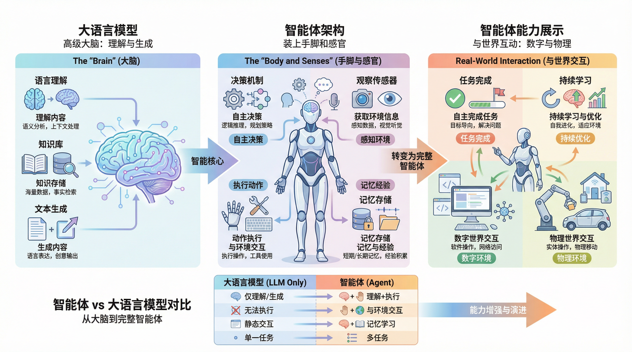 如果说大语言模型是能够理解和生成内容的高级“大脑”,那么智能体(Agent)则是在此基础上,为其装上了“手脚”和“感官”,使其能够与数字世界或物理世界进行交互,并自主完成任务。