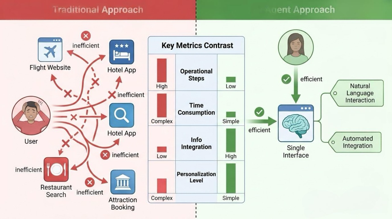 智能体的核心价值在于实现“端到端”的任务自动化。用户不再需要一步步地指导计算机如何操作,而只需提出最终目标,智能体便能自主规划并执行所有中间步骤。这标志着人机交互从“指令式”向“意图式”的根本性转变。 以旅行规划智能体为例,想象一下,用户不再需要分别打开多个网站搜索航班、预订酒店、查找餐厅,而只需对一个旅行规划智能体说:“帮我规划一个下个月去东京的5日自由行,预算1万元,我喜欢动漫和美食。”