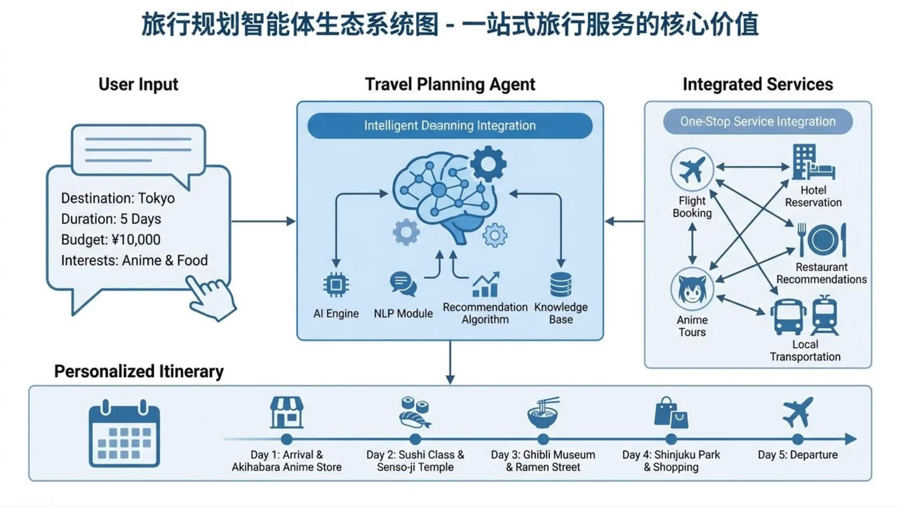 1)感知与理解:解析用户的意图,提取关键信息:目的地(东京)、时间(下个月)、时长(5天)、预算(1万)、偏好(动漫、美食)。