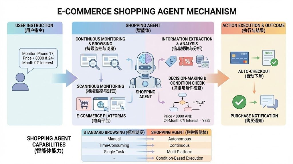 电商领域: 用户可以部署一个“购物智能体”,指令是“帮我监控全网iPhone 17的价格,一旦有平台价格低于8000元且提供24期免息,就自动下单购买”。这个智能体能持续浏览各大电商网站,分析商品页面,识别价格和优惠信息,并最终执行购买操作。
