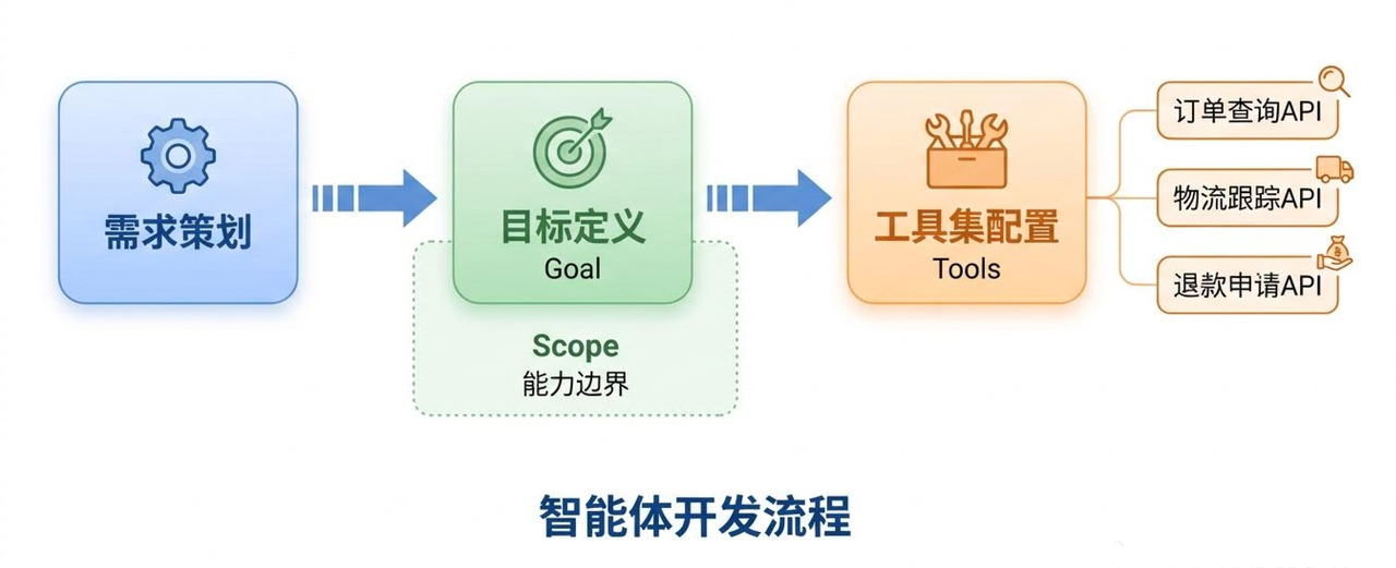 1. 需求策划与目标定义: 这是最重要的一步。必须清晰地定义智能体的核心任务是什么(Goal),它的能力边界在哪里(Scope),以及它被允许使用的工具集(Tools)。例如,一个电商客服智能体的目标是解决售后问题,其工具集可能包括订单查询API、物流跟踪API和退款申请API。