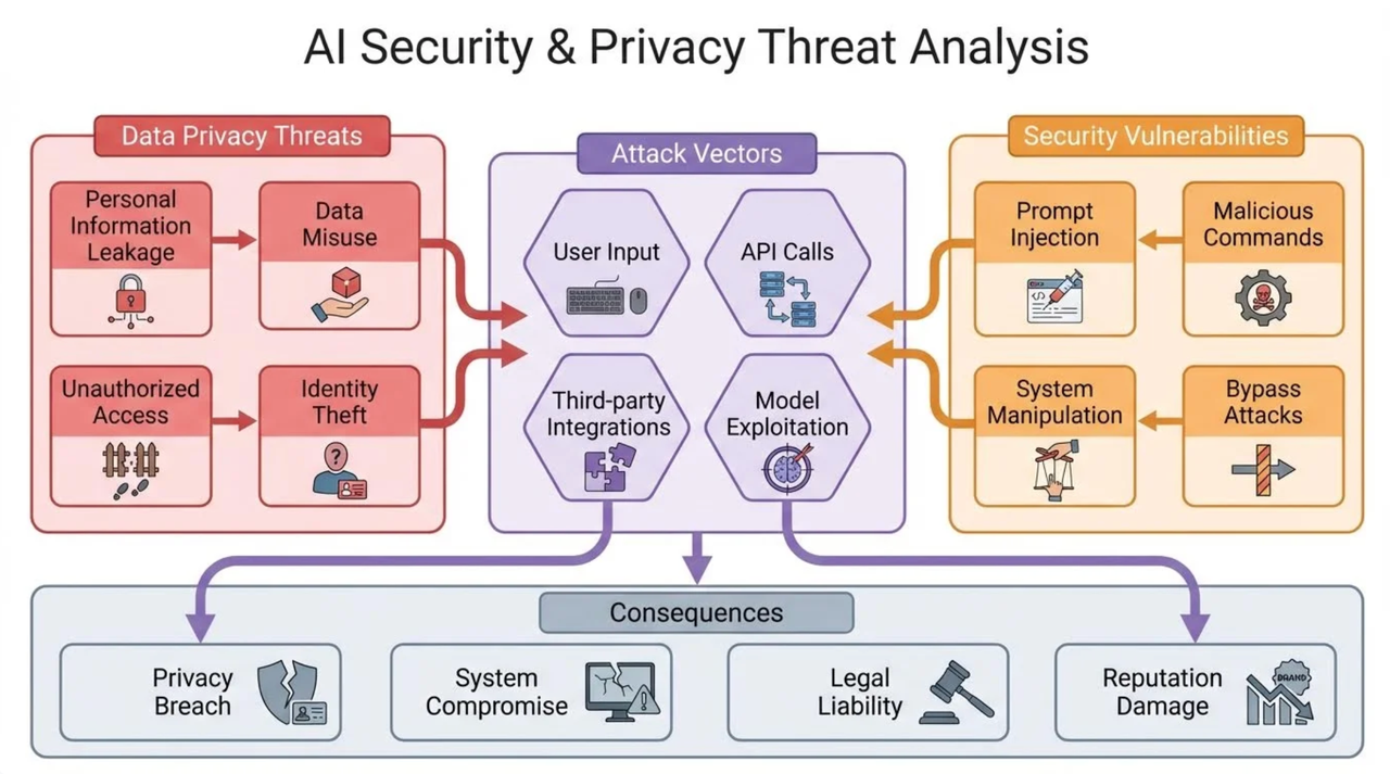 应对策略: 严格遵守数据隐私法规(如GDPR),对用户数据进行匿名化处理。在系统设计上,对用户输入进行严格的过滤和审查,防止恶意指令绕过安全限制,执行危险操作。