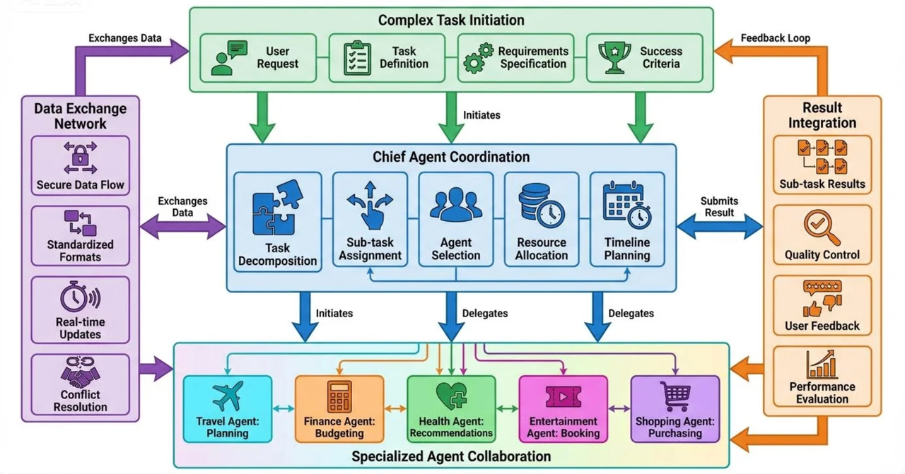 用户可能拥有一个“首席智能体”,它可以根据用户的需求,去“雇佣”和协调其他更专业的智能体(如旅行智能体、理财智能体、健康智能体)来协同完成复杂任务。互联网公司未来的竞争,可能将从开发独立的App,转向开发功能强大、易于集成的专业智能体,并争夺成为用户首选的“智能体商店”或底层操作系统。