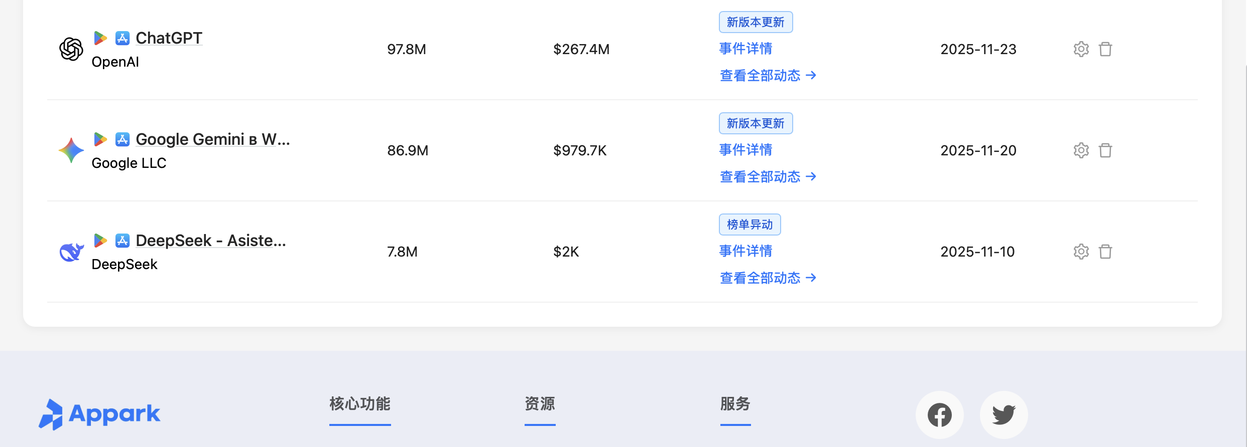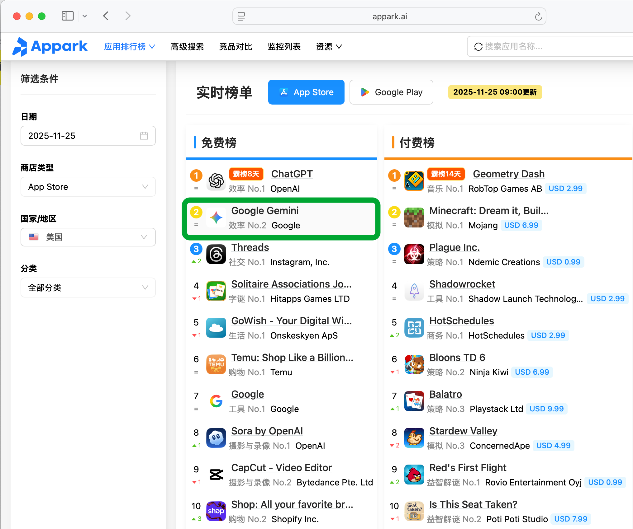 gemini热度太高了,我上周也把它加入了监控,每天收到Appark的邮件,汇总了gemini排名在各商店和地区的变化情况。现在已经在app store免费榜冲到第二了,仅次于Chatgpt