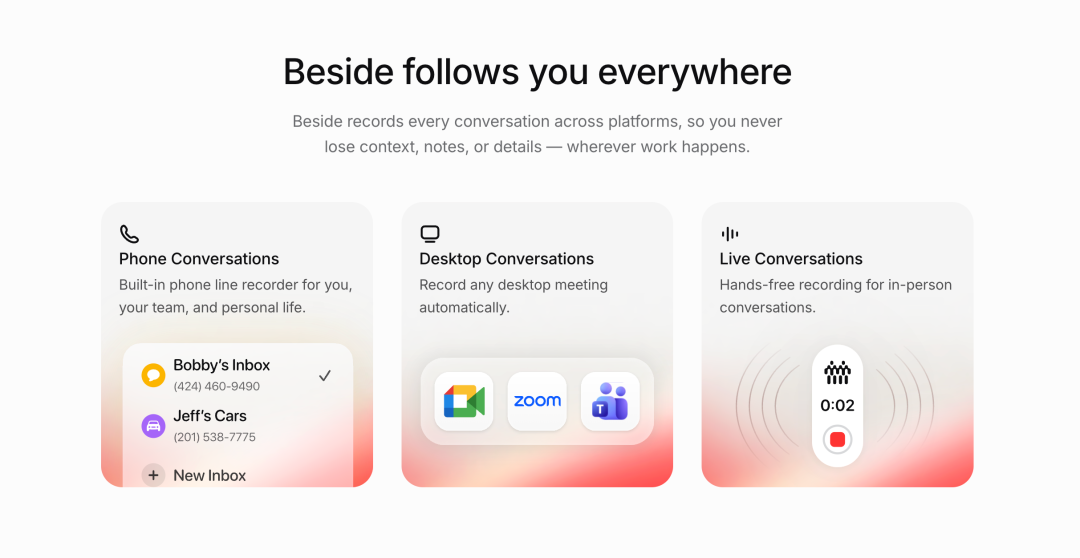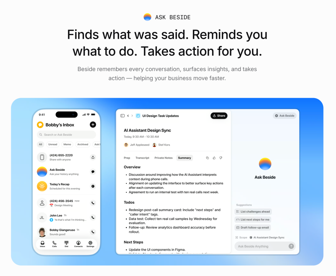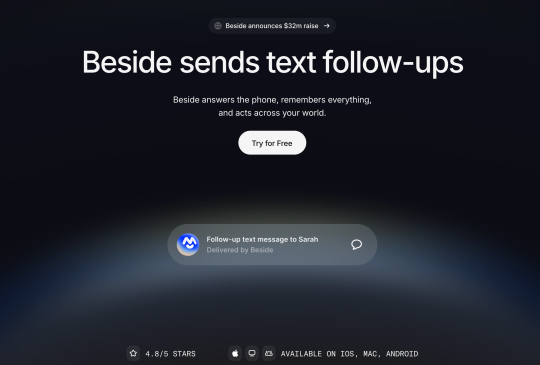 Beside 完成 3200 万美元融资,从底层重建电话系统,以 AI 赋能电话 / 短信的理解、记录与行动转化,精准服务 1 亿靠电话工作的一线从业者与小企业,破解未接来电、客户细节遗漏等痛点,成为真实经济的智能沟通基础设施