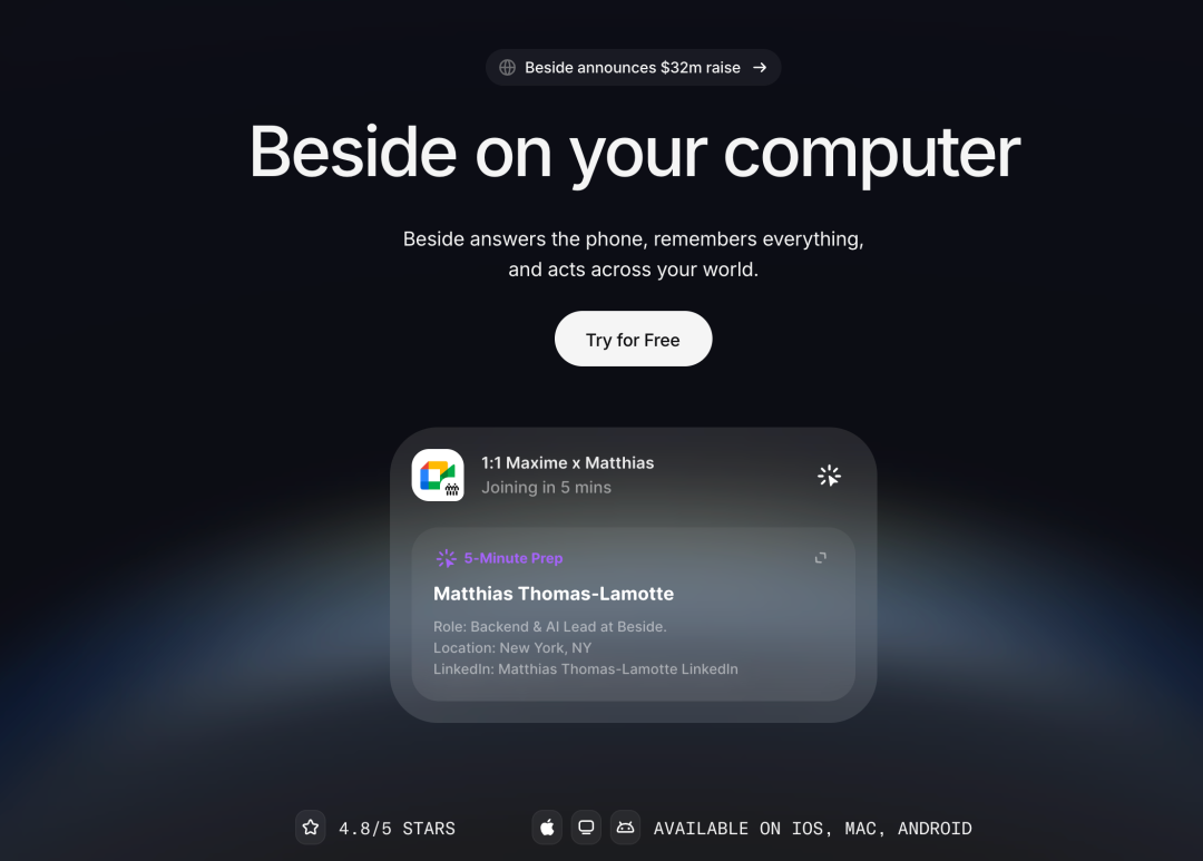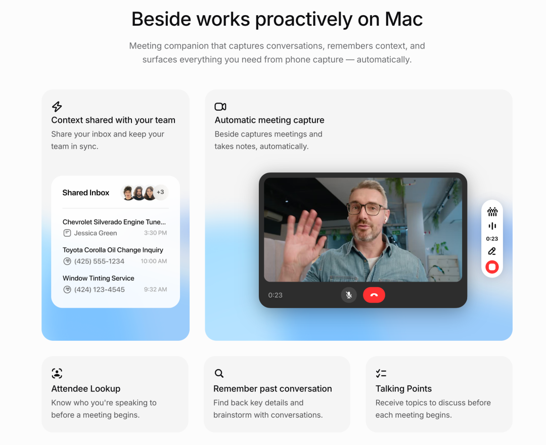 Beside 的故事其实从 18 个月前就开始了,只是大多数人并不知道。当时他们以 M1 的名字悄悄运营,专注于打造一个 AI 接待员来处理电话和短信。我觉得这种低调的策略非常聪明。在当今这个人人都急于发布产品、抢占眼球的时代,Beside 选择先埋头打磨产品,用实际效果说话。