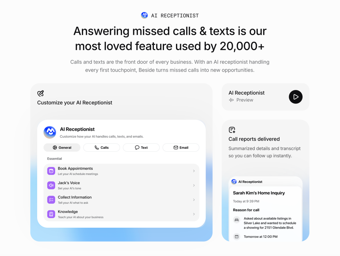 这种来自真实世界的洞察,让 Beside 在产品设计上与众不同。他们不是坐在办公室里想象用户需要什么,而是真正理解这些用户的日常挣扎。承包商在工地上,双手沾满泥土或油漆,无法立即接电话。房地产经纪人在开车带客户看房,错过了另一个潜在客户的来电。美发沙龙老板在给客户做头发,听到电话响起却无法离开。这些场景中,每一通未接来电都意味着潜在的收入损失。