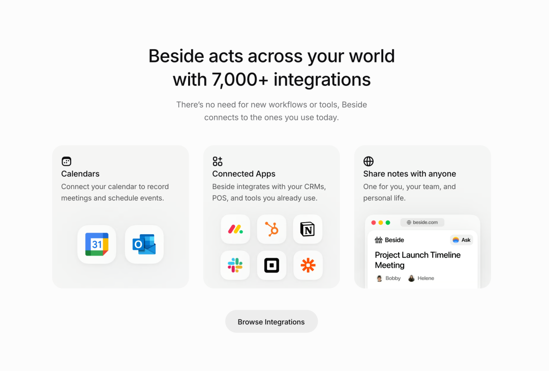 但 Beside 的消费者导向策略并不意味着忽视企业市场。相反,他们正在从底层向上构建——先让个人用户爱上产品,然后自然地扩展到小团队,最终进入企业。这种自下而上的增长策略已经被 Slack、Dropbox、Zoom 等公司证明是有效的。当一个团队中的几个人已经在使用并依赖某个工具时,说服整个团队采用这个工具就容易得多。