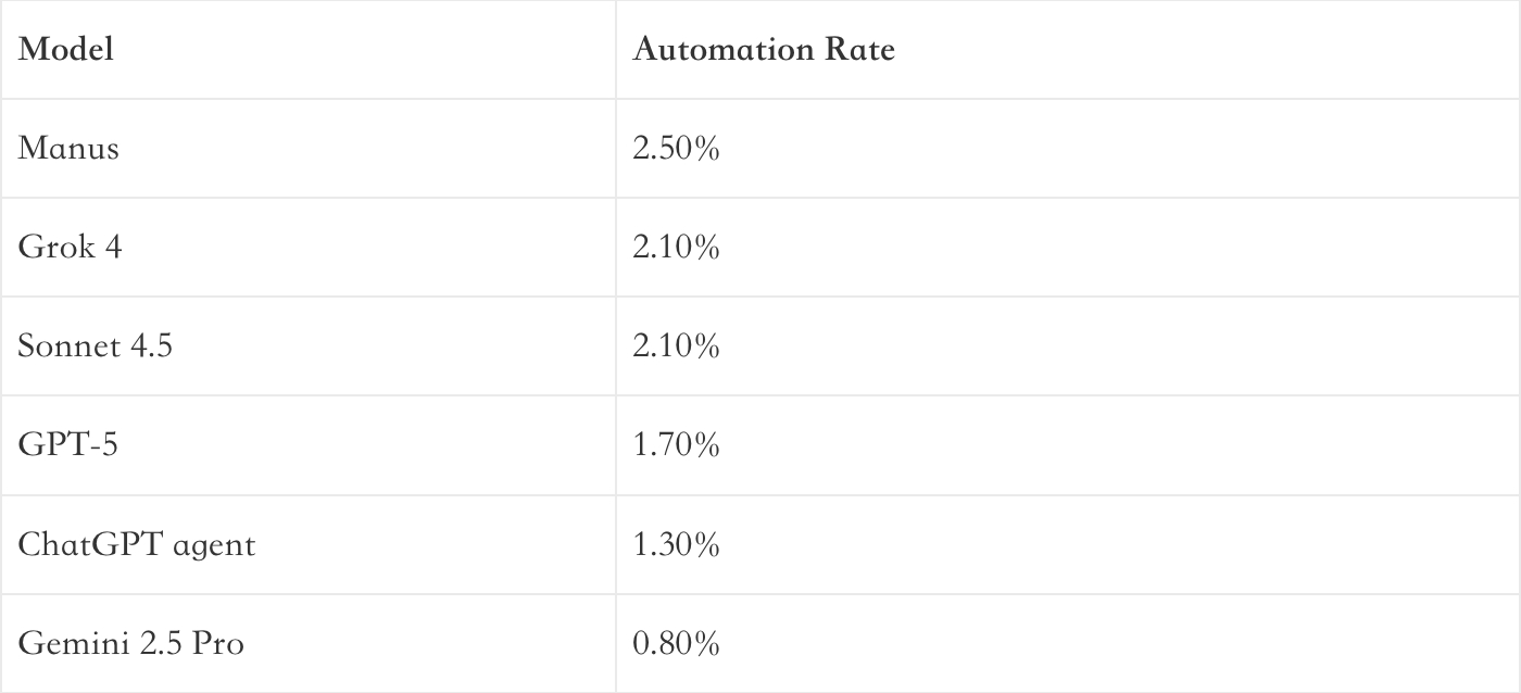 看下图,虽然我们看到在增长,但最高也仅仅停留在 3.9% 左右 。也就是…面对这价值 14 万美元的工作,如果完全依赖目前最先进的 AI 技术(包括 Manus、GPT-5 等),顶多能省下 4% 的钱。