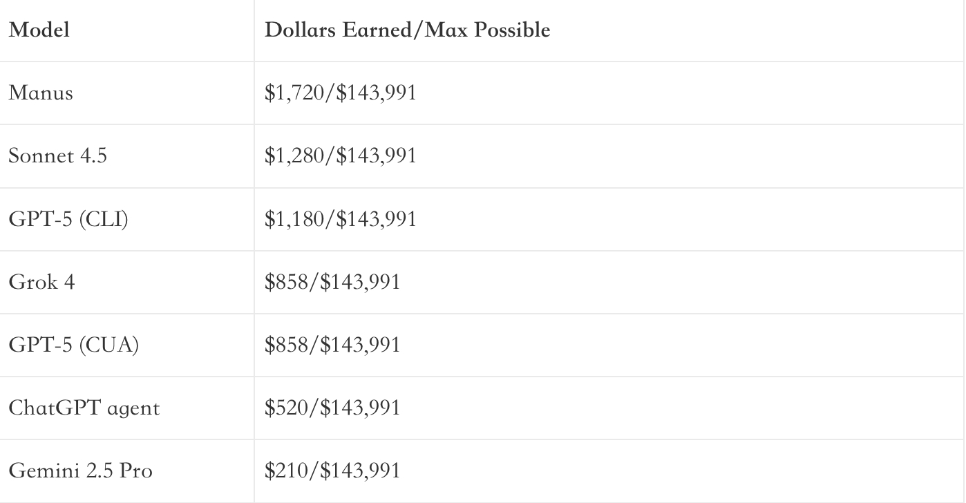 赚到的钱: 整个题库价值 $143,991,表现最好的 Manus 只赚到了 $1,720,Gemini 更是只赚了 $210。