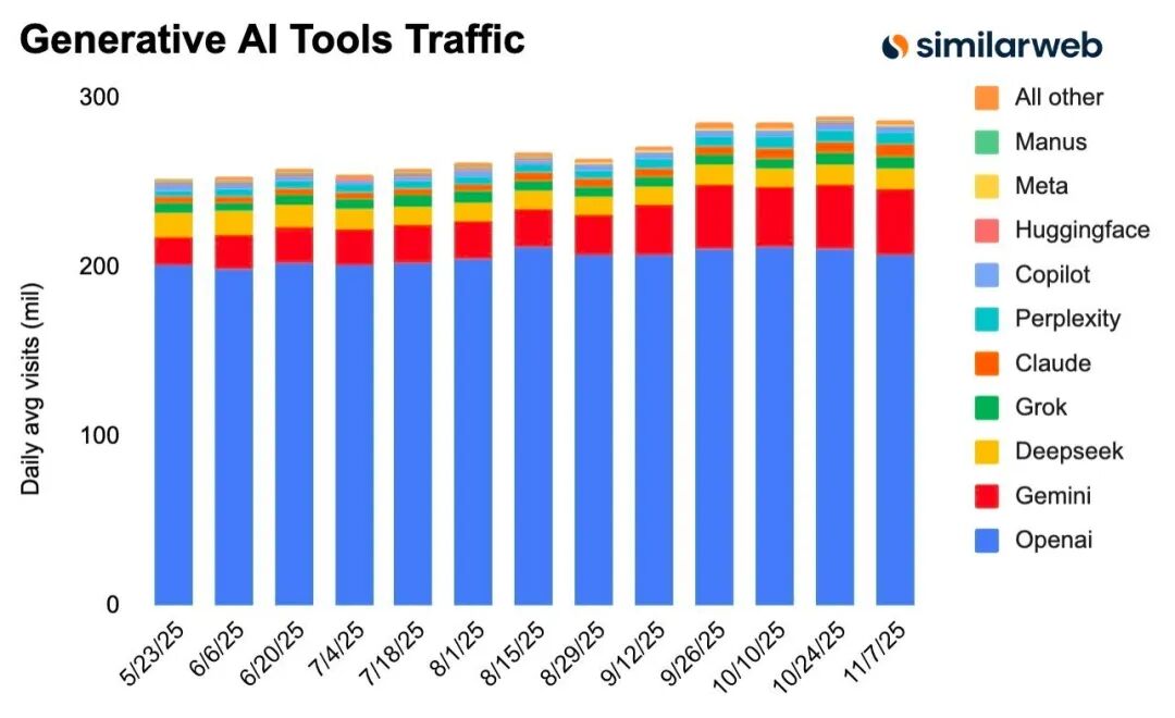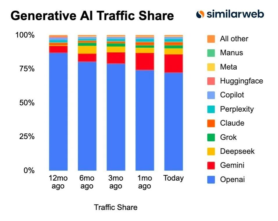 ChatGPT:72.3% Gemini:13.7% DeepSeek:4.2% Grok:2.5% Claude:2.4%,所以尽量使用用户量大的模型。