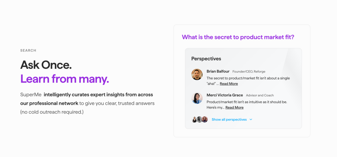 SuperMe 从一开始就把自己定位为网络优先的产品。这一点至关重要,因为这个领域的防御性将来自网络智能——当可信的同行贡献和比较观点时所形成的活跃图谱。SuperMe 的搜索正是为此而构建的:观点搜索将商业问题路由到最相关的专家,通过他们的 AI 回答,并让你比较不同的观点。这就是建议在现实世界中真正的运作方式。