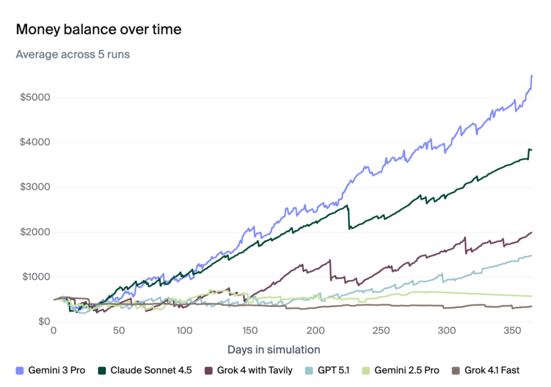 最终结果怎么样呢?开局500美元,每个模型跑五轮算平均值,Gemini 3 Pro的最终资产为5478.16美元,拿下了第一。第二名Claude Sonnet 4.5一下子降到了3838.74美元,第三名Grok 4更是只有1999.46美元。