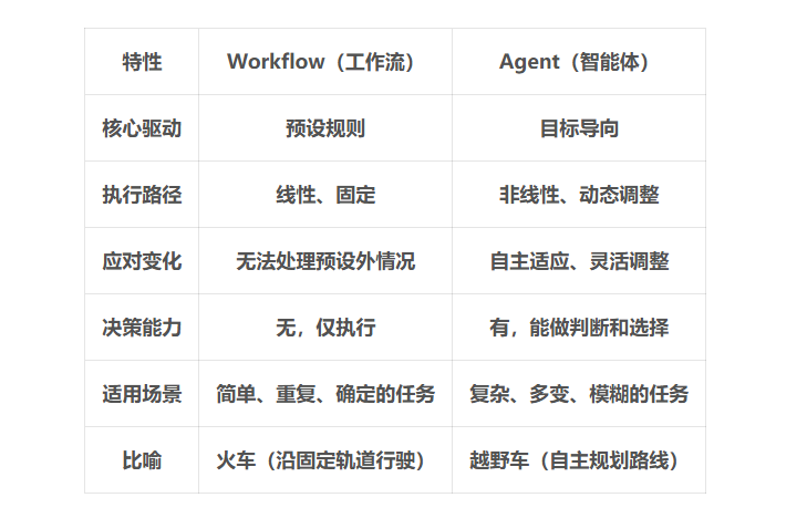 说到Agent,很多人会觉得这不就是”更智能的工作流”吗?毕竟工作流(Workflow)也是自动化执行一系列任务。但这其实是一个很大的误解,Agent和Workflow有着本质的区别。如果用一个比喻来说,Workflow就像铁轨,而Agent就像越野车——它们虽然都能帮你到达目的地,但工作方式完全不同。