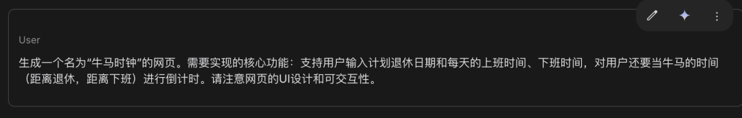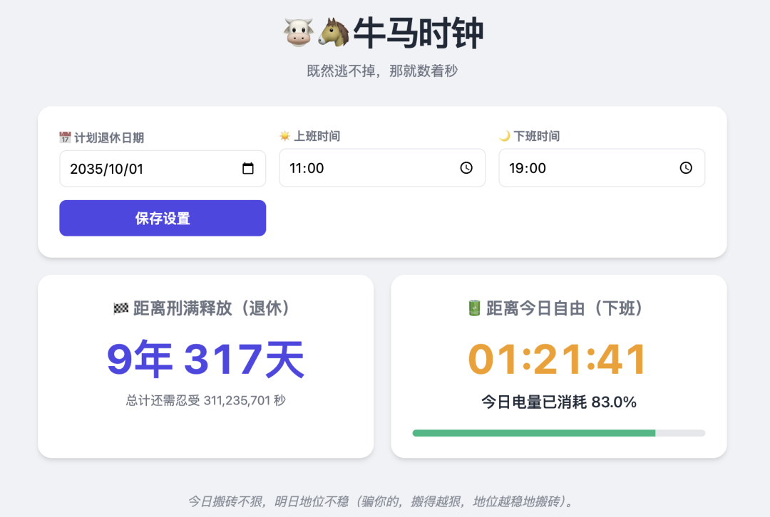 牛马时钟是本次实测中需求最简单的一个案例。交互层面,用户只需要选择计划退休时间、上班时间和下班时间,剩下的都是计算和前端显示。没有经过任何调试,最终效果几乎挑不出毛病来。
