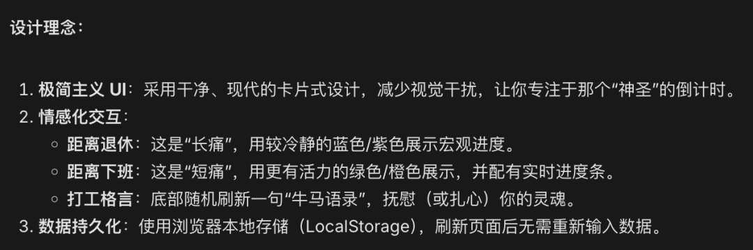 从思考过程看,这位AI牛马非常认真地思考了交互和UI方案,甚至还创作了一套在底部随机刷新的“牛马语录”,这些都是提示词里没有给出的需求。