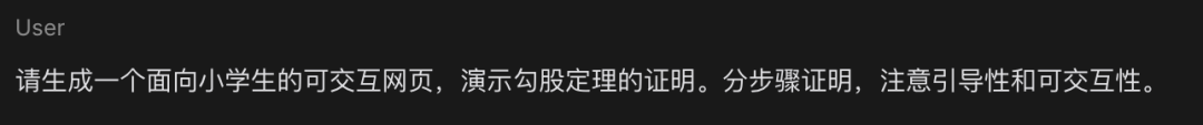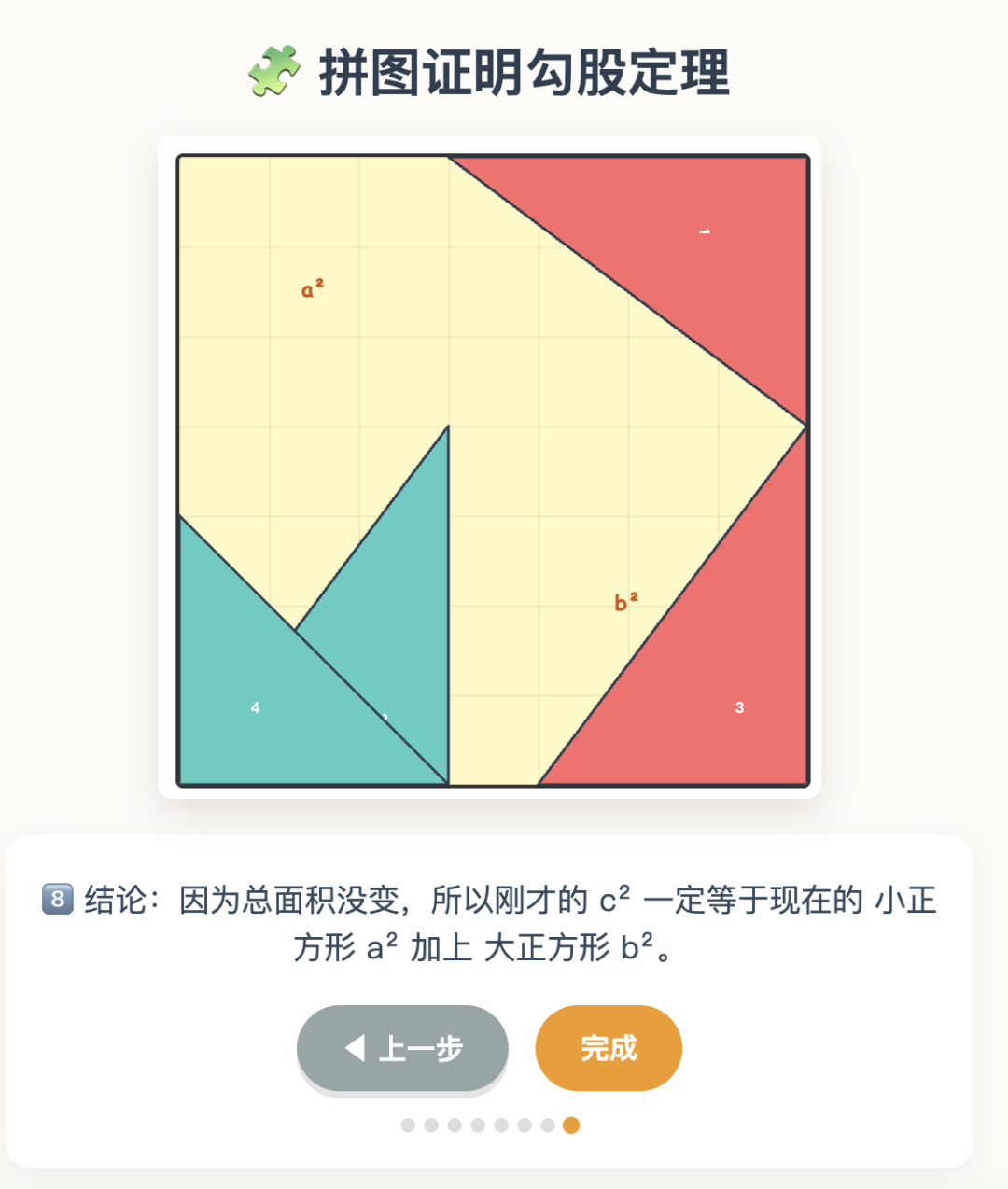 成功做出第一类工具网页后,我开始思考,Gemini 3能否做一些用于教育场景的小应用,例如给小学生演示勾股定理的证明。