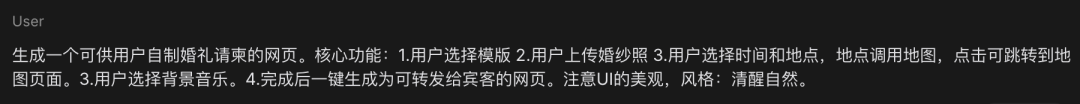 如果只是为了实用,还有一种更简单的办法:写死!写死!通通写死在代码里!与其做一个功能复杂的请柬生成器,再用它生成一张电子请柬,不如直接把信息告诉G老师,让它直接写一个可分享的请柬网页。于是提示词修改如下: