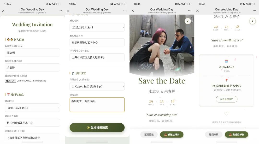 总之,大约10分钟的调试后,我成功获得了一个可以直接分享给宾客的定制婚礼请柬。