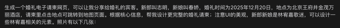 另一个可应用的场景是婚礼电子请柬。尽管现有的婚恋APP支持用户免费制作电子请柬,但很难实现定制效果,还要忍受请柬上出现婚恋APP的水印。用Gemini能否自己做一个电子请柬的制作网页呢?