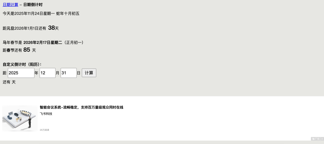 而搜索“日期倒计时”,点进前排的在线网页,界面展示毫无设计可言,底部的广告贴条却格外醒目。