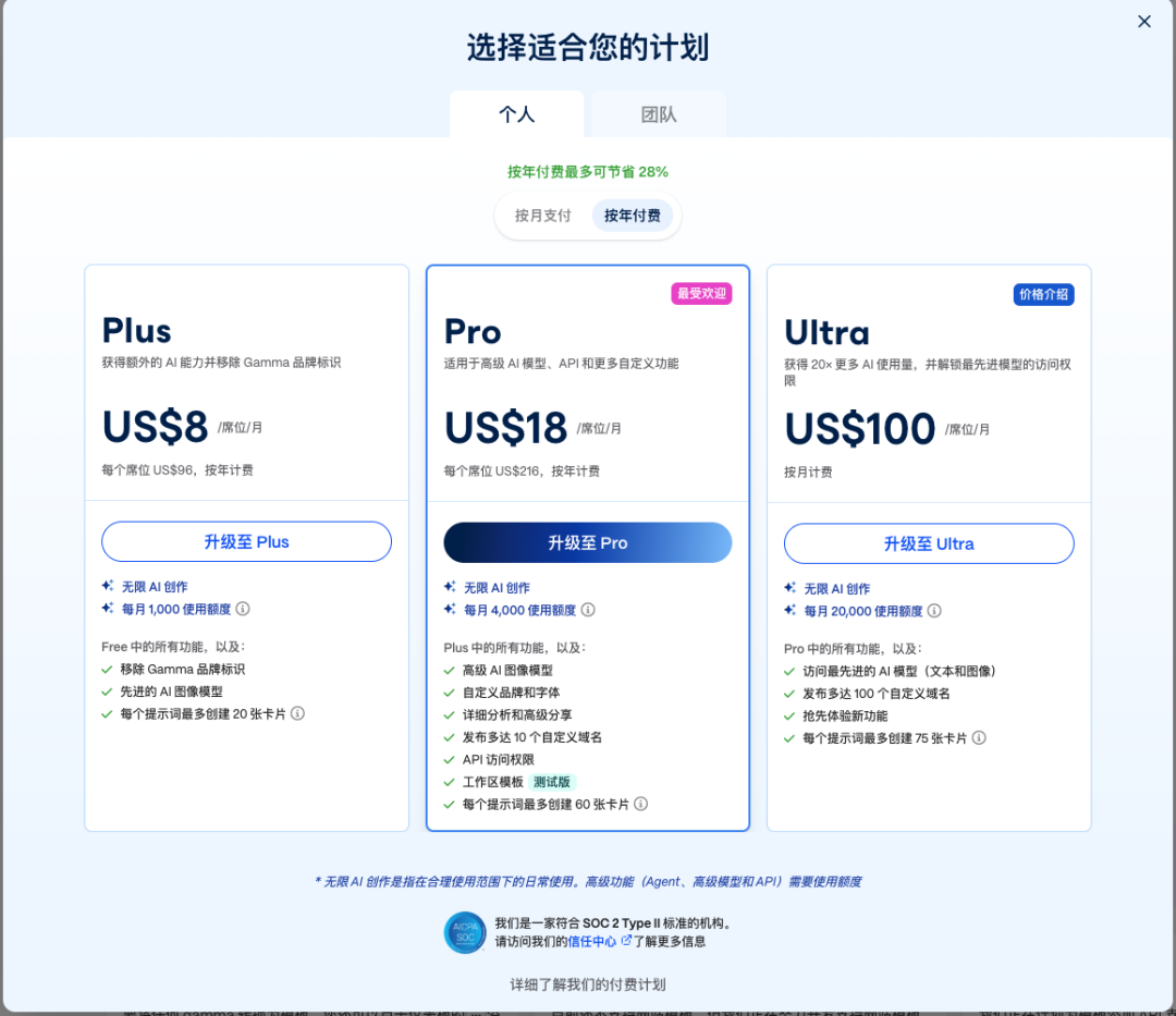 媒体报道中提到,Gamma 大约有60万付费用户,对应1亿美元 ARR,也就是说,客单价大致是几十美元/年,符合 SaaS 型创意工具的定价区间。