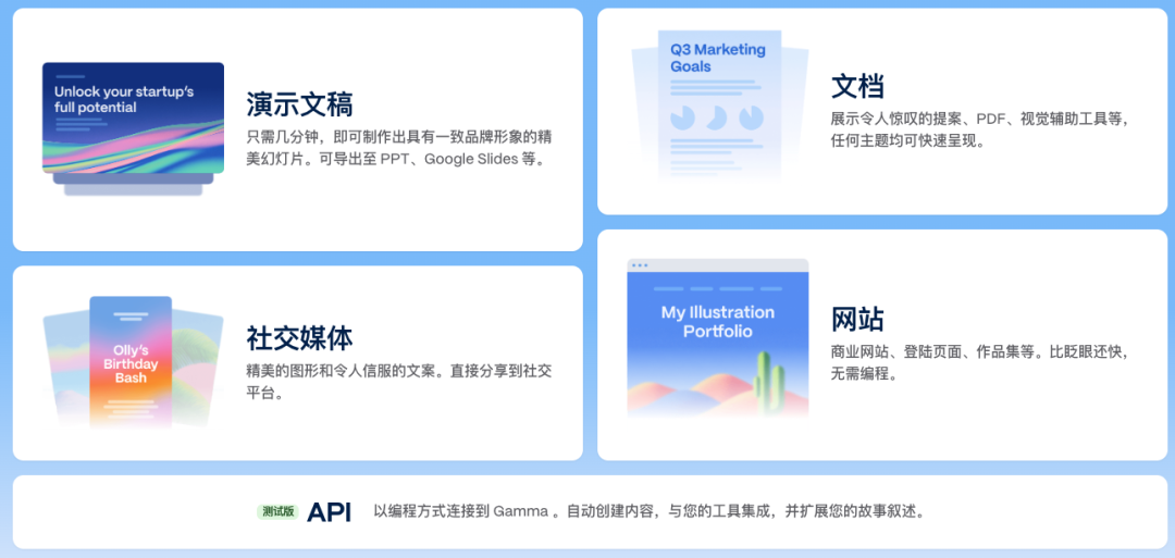 目前公开产品能力主要集中在四类输出上:演示文稿、文档与提案、网站与登陆页、社交媒体素材。