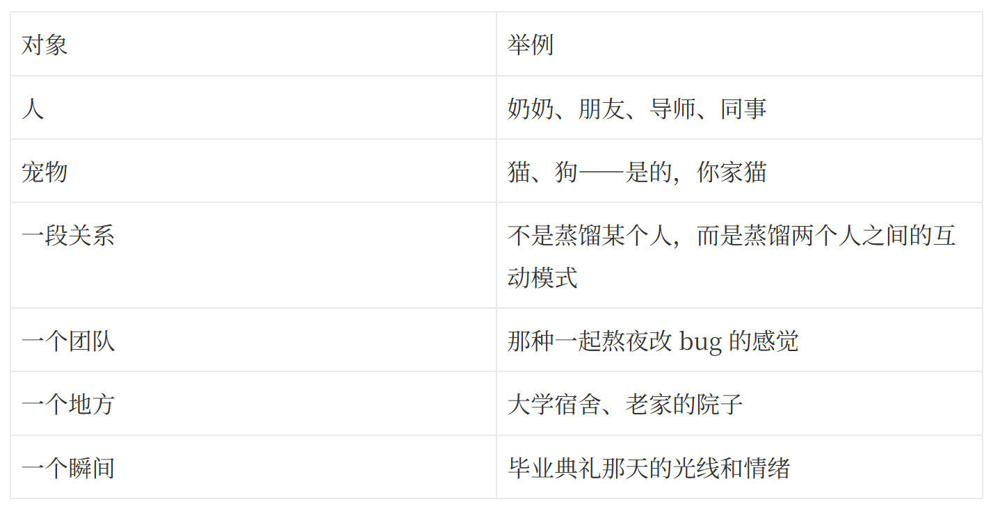 同事是人,前任是人,导师是人。但值得被记住的,远不止人。你家猫凌晨三点开始跑酷的声音,大学宿舍下午四点的光线,创业团队每周五晚上一起点外卖的默契——这些东西没有聊天记录,没有微信语音,没有导出工具。但它们真实存在过,而且正在一天天变模糊。