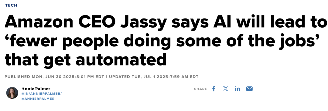 早在六月,亚马逊首席执行官Andy Jassy就表示,AI的能力将使亚马逊未来能够缩减其白领员工队伍。