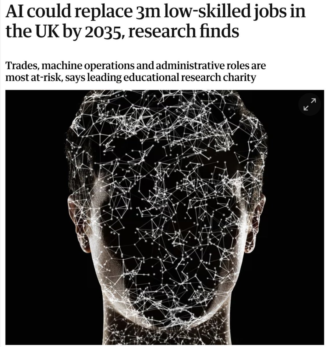 英国国家教育研究基金会(NFER)的一份新报告警告称,到2035年,AI和自动化可能会取代英国多达300万个低技能岗位,尤其是技工、机器操作和行政职位。
