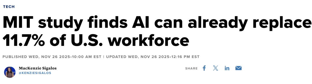 而来自MIT的研究发现,AI已经能取代11.7%的美国劳动力。