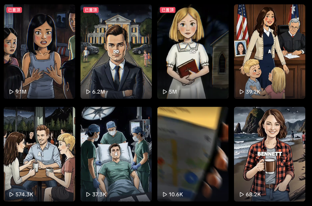 即便不带入短剧的逻辑来看,“AI动画+旁白解说”这种形式也是很多海内外AI账号起号的流量密码。例如,TikTok账号“crimeflixusa”便利用高饱和度的美漫动画风格,将世界各地耸人听闻的真实犯罪案件制作成时长约1分钟、节奏紧凑的解说视频,单条视频播放量最高达900万。