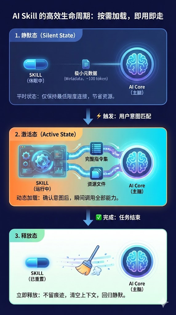 - 静默态:平时仅向 AI 暴露极小的元数据(Metadata,约 100 token)。