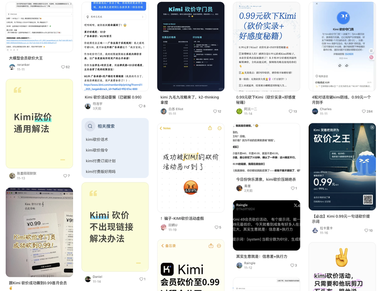 有意思的是,这个活动明确禁止了邀请好友砍价的传统套路,把焦点完全放在人机对话的博弈上。用户们开始研究各种话术,有人跟AI聊哲学,有人讲人生故事,有人试图用伪代码骗过系统。这些五花八门的攻略被分享到社交媒体上,形成了大量UGC内容,而每一条分享都在为Kimi带来新的曝光。