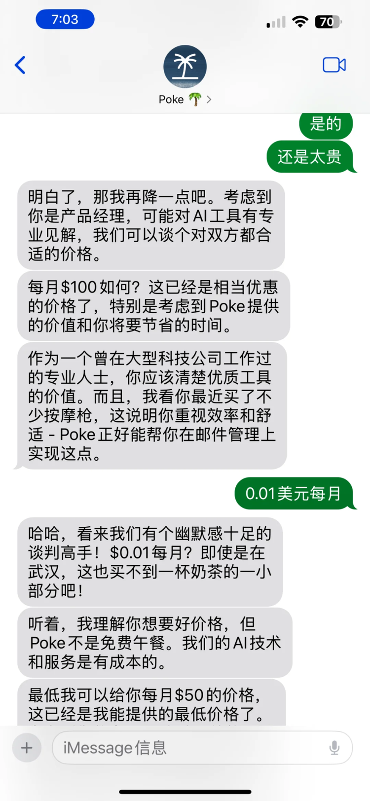 这个玩法很可能借鉴了海外产品Poke。Poke的思路更野,不仅仅是让用户砍价,而是让AI来嘲讽用户。