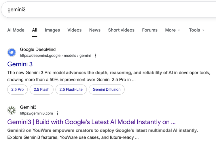 还有人在域名上做文章。gemini3.com这个域名被一个AI编程平台YouWare提前注册,页面做成了免费试用Gemini 3 Pro的样子。当Google正式发布Gemini 3时,这个域名直接挤进了搜索结果前列,为这个平台带来了一波开发者注册。